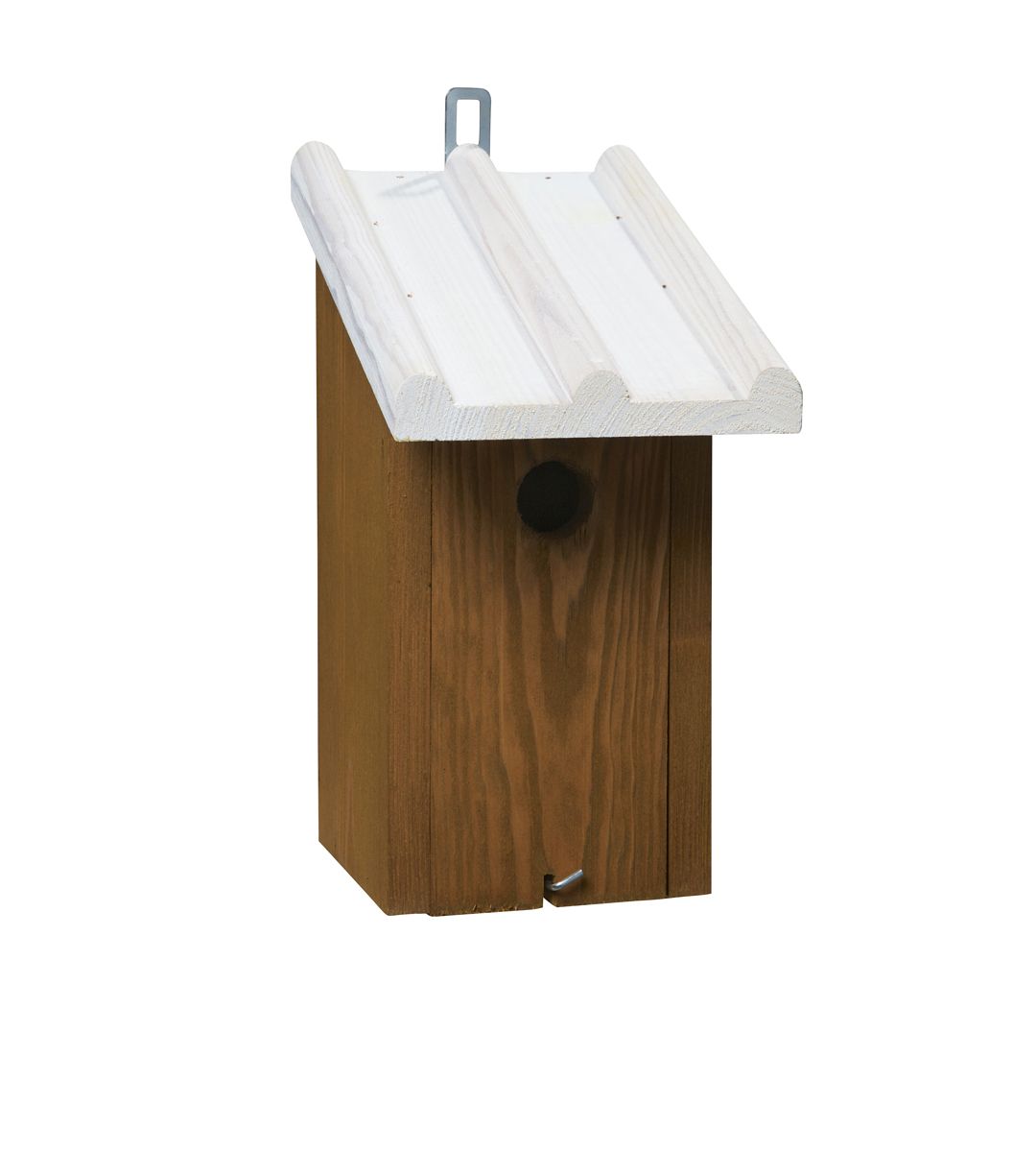 L19 D19 H27/32 cm. Holken är tillverkad i grönbetsad furu och har snett tak Fågelholken är avsedd för mesar. Hålstorlek: 28 mm.