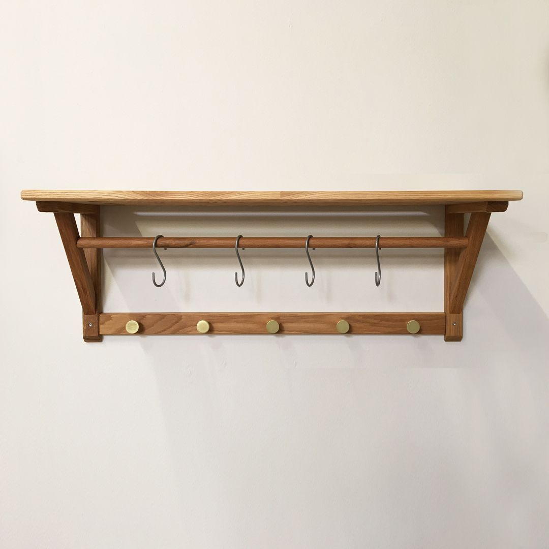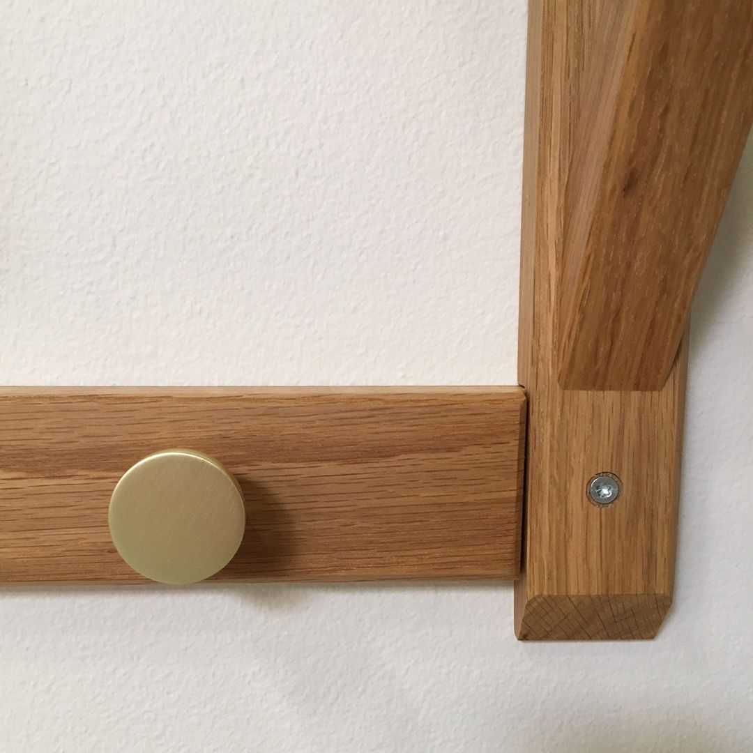 En snygg och modern hatthylla i oljad massiv ek med 5 fastmonterade krokar borstad mässing-look och 4 metall S-krokar i matt metall. Utöver upphängning av kläder kan hyllan också användas för förvaring av antingen hattar, halsdukar eller väskor. Hyllan levereras omonterad, har en bredd på 1000 mm och ett utsprång på 300 mm.