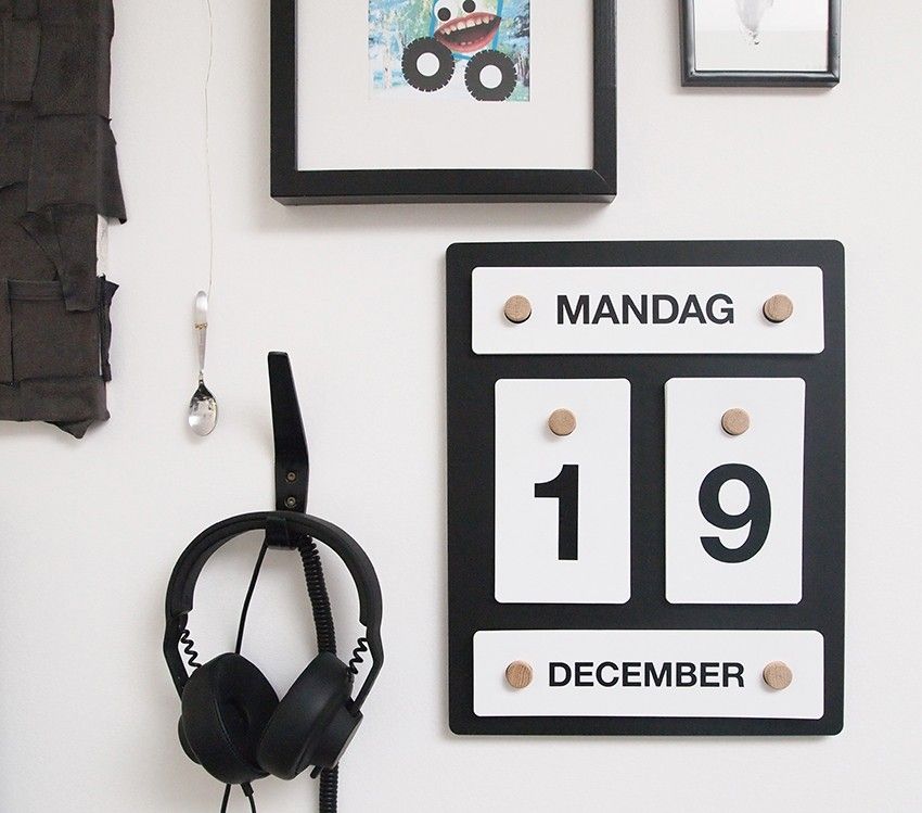 En fin kalender tillverkad i kvalitetsmaterial. Bakstycke i svart MDF med slitstark och modern laminatyta. Knopparna är tillverkade i ek och har en vacker finish. Siffror/veckodagar/månader är tillverkade i kraftig plast med mattsvart tryck och levereras i en separat förpackning. (Ett extra set siffror 0–9 medföljer.)