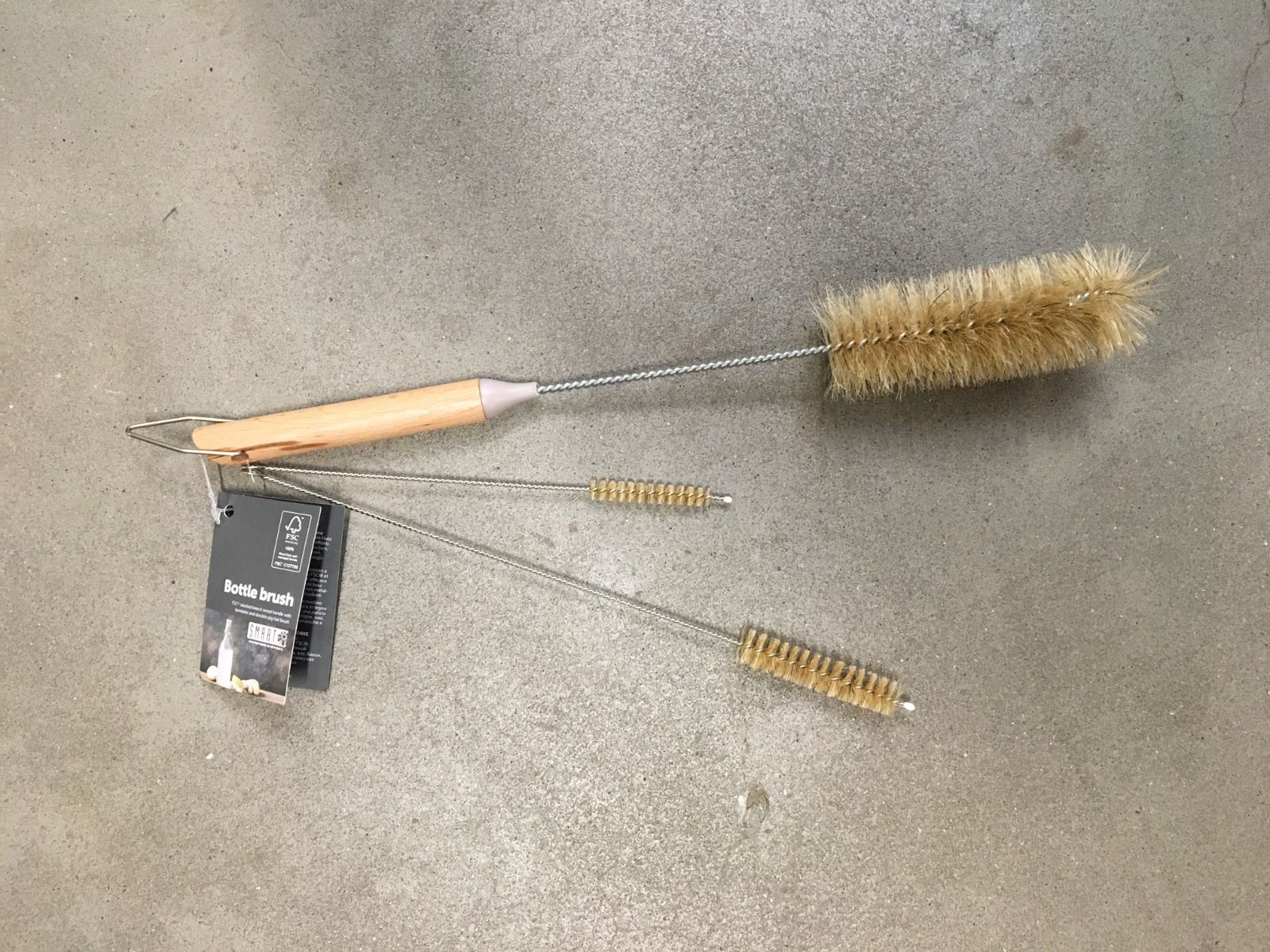 Flot sæt med lang kost og fejebakke. Børsterne på kosten er lavet af hestehår. Og kostens/fejebakkens stang er træ.