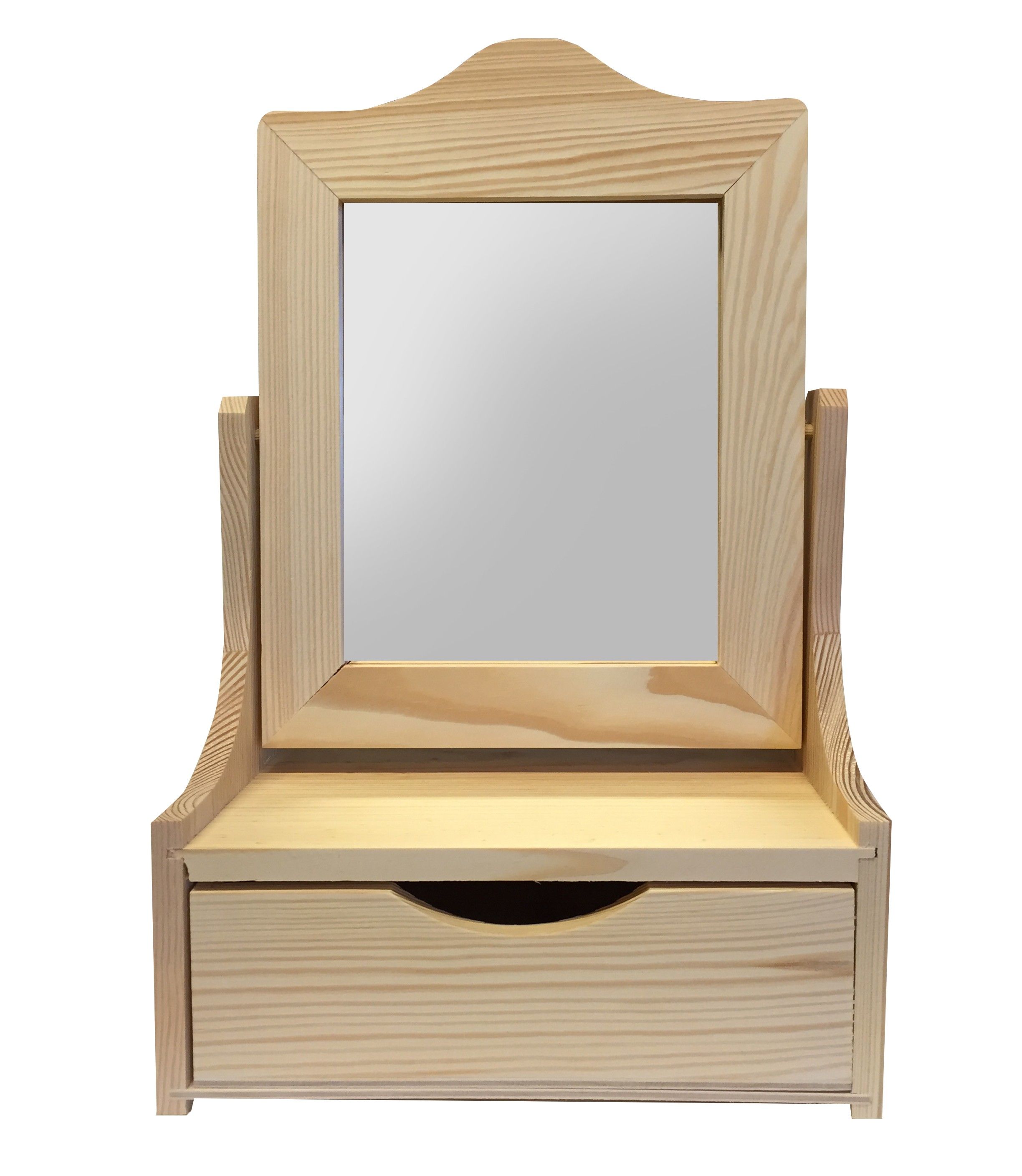Smukt, lille smykke-/makeupspejl med skuffe - Spejlet kan vippes. Spejl med ramme i ubehandlet massiv fyr. Rammen kan behandles eller males, så den får et personligt præg.